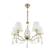 Материал арматуры – металл золотого оттенка. Оригинальные плафоны фантазийной формы также выполнены из металла. Цвет плафонов – белый. Источник света – лампа с цоколем E14.