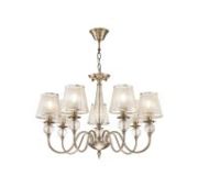Дизайн светильников – это дуэт вечной классики и высоких технологий. Арматура и абажуры выполнены в приятном для глаз теплом белом цвете. Абажуры сделаны из ПВХ и ткани, а арматура - из стекла и металла. Светильники украшены декоративными стеклянными подвесками в виде капель.