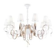 Металлическая арматура, цвет – золото с кремовыми вставками. Декоративные рожки с флористическими элементами. Источники света в форме свечей. Высота люстр регулируется длиной цепи.