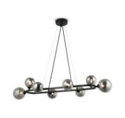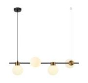 Металлическая арматура, цвет - черный + латунь. Стеклянные плафоны в двух оттенках - матовый белый или дымчатый. Направление плафонов в разные стороны позволяет распределить свет максимально равномерно. Источник светал - лампы с цоколем G9.