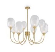 Материал арматуры - металл, цвет - латунь. Серия вдохновлена эстетикой северных лесов. Плафоны - литое цельное стекло в форме и фактуре среза дерева. Три варианта цвета плафонов: прозрачный; прозрачный + матовый; прозрачный + матовый + изумрудный. Эстетичные крепления и магнитная потолочная чаша без видимых болтов. Готовые композиции из 1, 5, 7 и 12 плафонов. Источник света - лампа с цоколем G4.