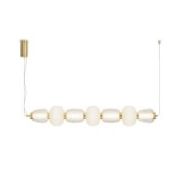 Материал арматуры - металл, цвета - золото, хром. Микс плафонов: гладкие cферы коньячного или дымчатого оттенка + округлые рельефные с ромбовидным узором из прозрачного стекла. Регулируемая высота подвесных моделей - максимальная длина провода 3 метра. LED-источник света, цветовая температура 3000К