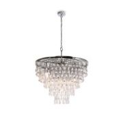 Металлическая арматура в двух вариантах цвета — хром или золото. Прозрачные декоративные элементы из хрустального стекла. Широкое кольцо снабжено LED-источником света. Цветовая температура потока излучения — 3000 К, угол рассеивания — 120 градусов. Регулируемый по высоте провод длиной 3 метра. Украшение шахматным рисунком.